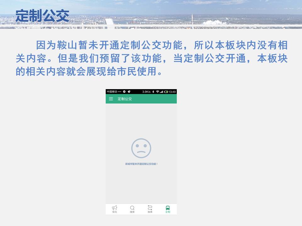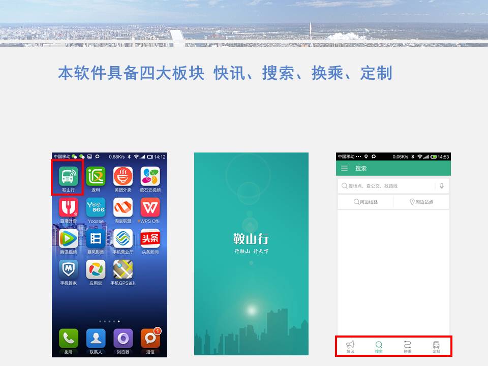 點點手機就可以看到公交車目前所在的位置,精準地掐好出門時間,從而避免在惡劣天氣或高峰期苦苦候車,工作人員坐在調(diào)度室內(nèi)就能掌握車輛在路上的運行情況……為方便廣大市民出行,基于安卓平臺開發(fā)的“鞍山掌上公交”官方APP將于11月15日正式上線試運行,適用于蘋果IOS系統(tǒng)的APP將于明年初上線,市民可在公共交通總公司官網(wǎng)下載該軟件,并實現(xiàn)37條公交線路車輛實時查詢的便利服務(wù)。